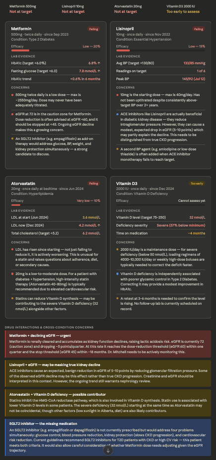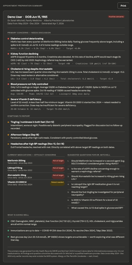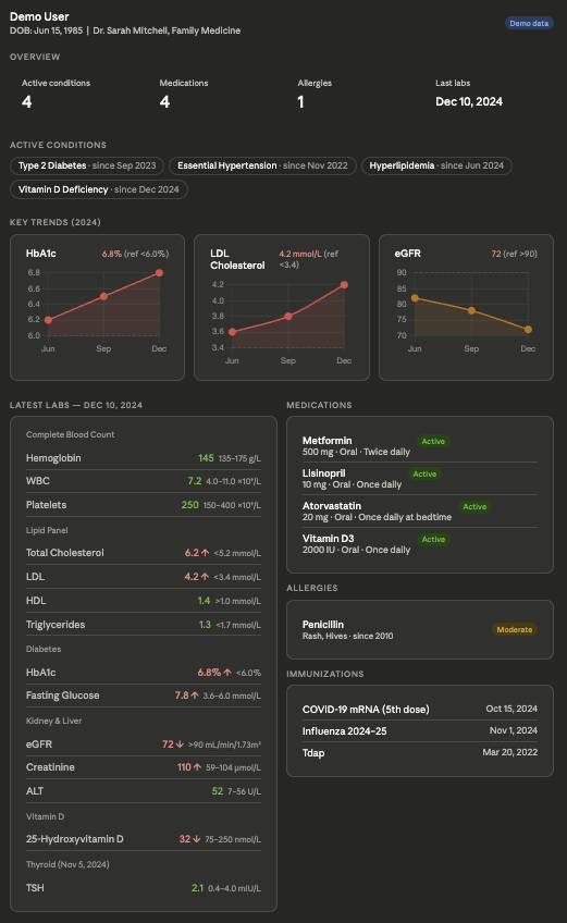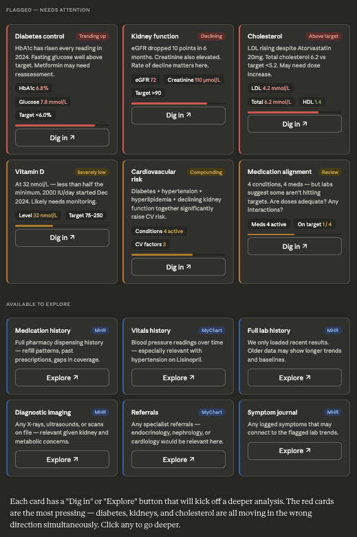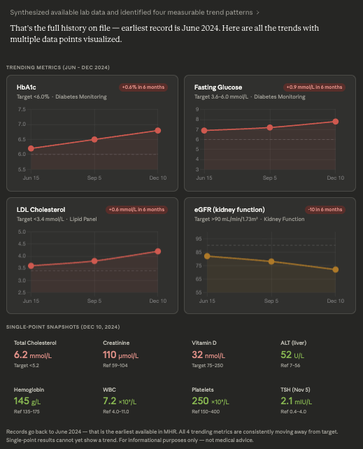 These are real screenshots from Claude Desktop analyzing sample Alberta health records. This is what happens when AI can see your labs, medications, vitals, and conditions all at once.