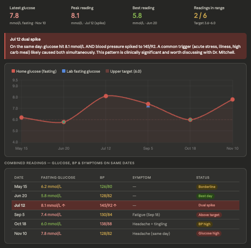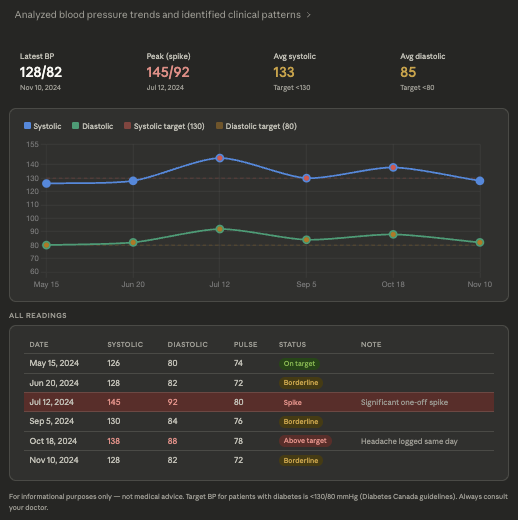 Claude connects the dots — a glucose spike and blood pressure spike on the same day suggests a shared trigger worth discussing with your doctor.